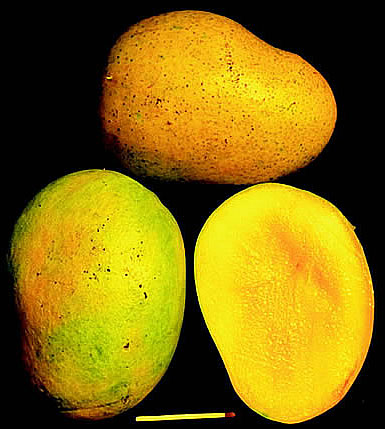 The fruit is large and oblong longer than broad but not as slender as Ngowe. The shoulders are only slightly curved, and the beak a pointed projection at the tip of a fruit is obscure. The average fruit dimensions are: 11.5 cm long by 7.8 cm broad with a weight range of 430–640 g (mean: 511 g). The fruits are pale olive green with bloom the delicate waxy or powdery substance on the surface of berries and yellow-apricot when ripe. The internal fruit quality is good to excellent; the flesh is of a deep orange colour, virtually free from fibre, juicy, and of a very strong typical mango flavour. Propagation by seed is possible.